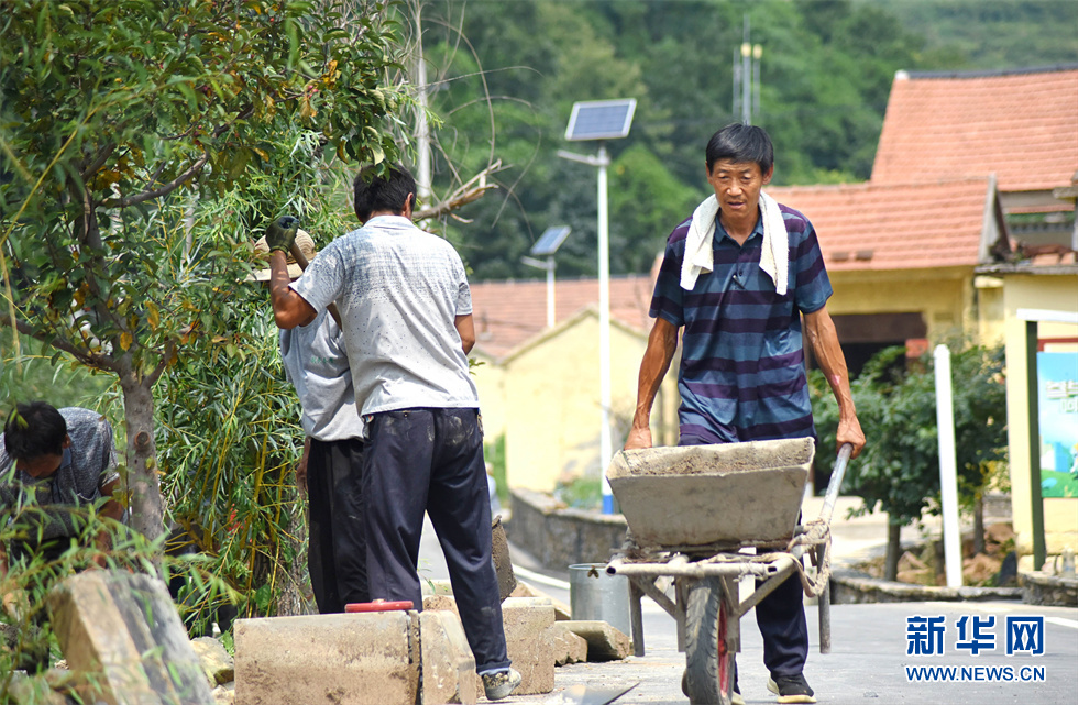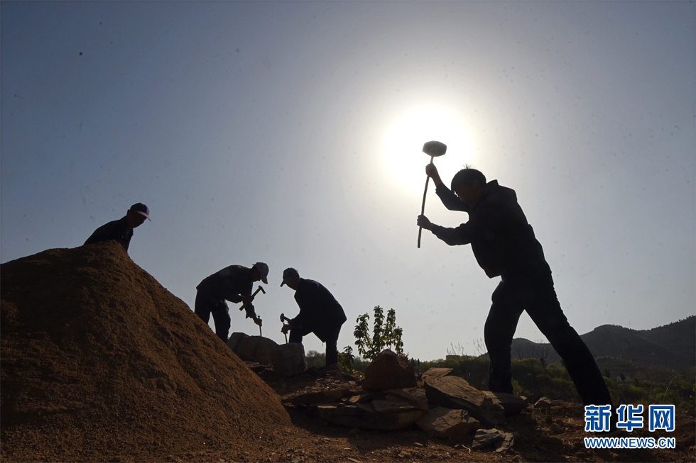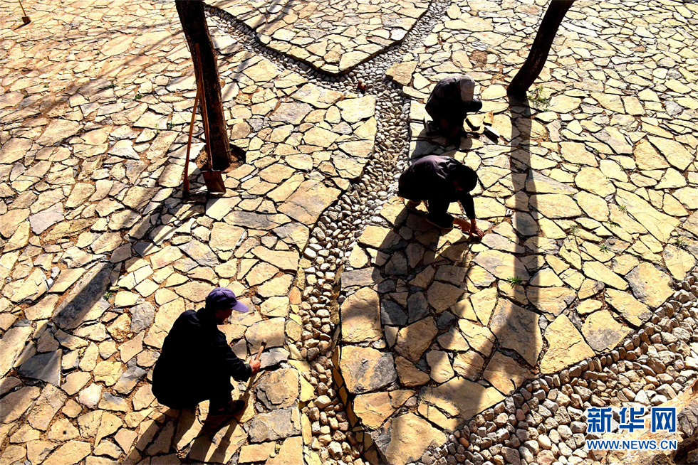 在山东省沂源县燕崖镇计宝峪村,冯成文(中)和村民一起用石块铺设路面(4月19日摄)