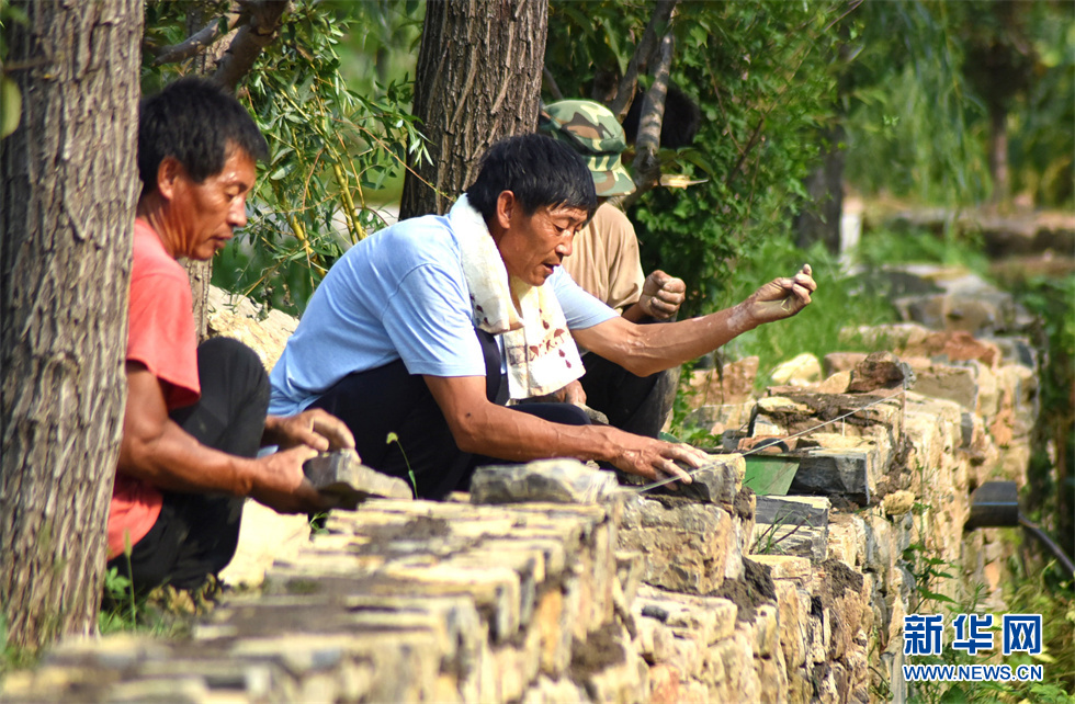在山东省沂源县燕崖镇计宝峪村,冯成文(右二)和村民一起垒砌村里的景观带。