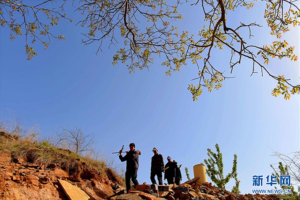 在山东省沂源县燕崖镇计宝峪村,冯成文(前)和乡亲们走在收工回家的路上(4月19日摄)。