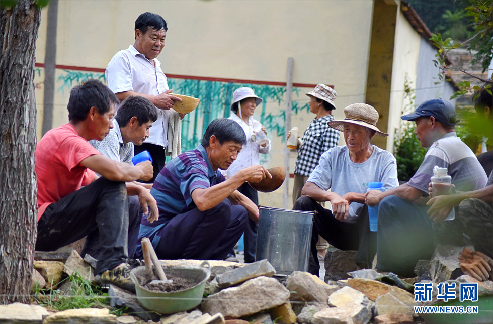在山东省沂源县燕崖镇计宝峪村,冯成文(左四)和村民聚在一起喝水休息。