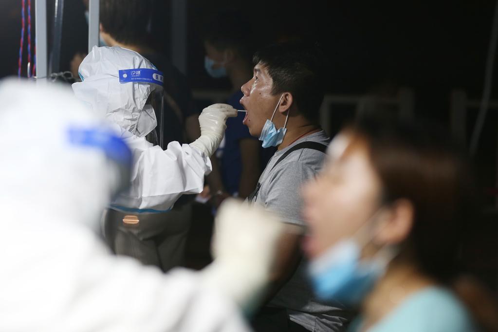 8月9日晚,在西安市浐灞生态区滨水花城核酸检测采集点,西安中医脑病医院医护人员为市民进行核酸采集