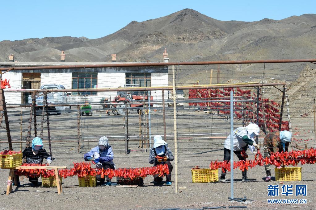 近日,新疆巴里坤哈萨克自治县三塘湖镇迎来辣椒丰收季,村民们抢抓晴好天气采摘、晾晒辣椒。