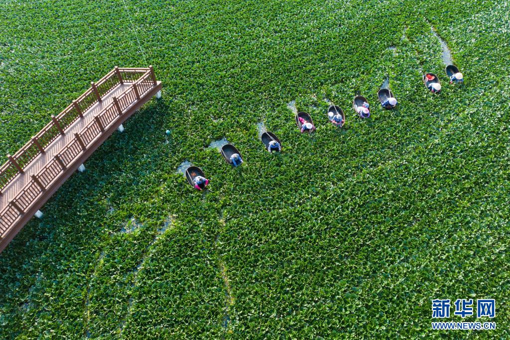 8月19日,在浙江省嘉兴市秀洲区油车港镇西千亩荡,菱农们坐着水乡特有的菱桶采摘成熟的菱角(无人机照片)。