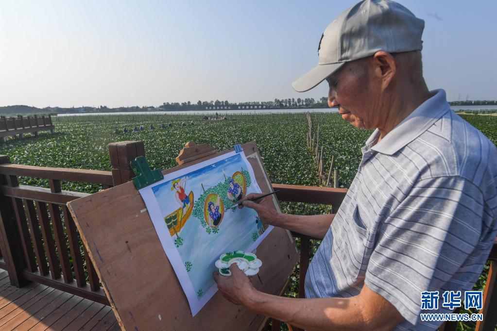 8月19日,在浙江省嘉兴市秀洲区油车港镇西千亩荡,一名农民画爱好者在创作采菱主题作品。
