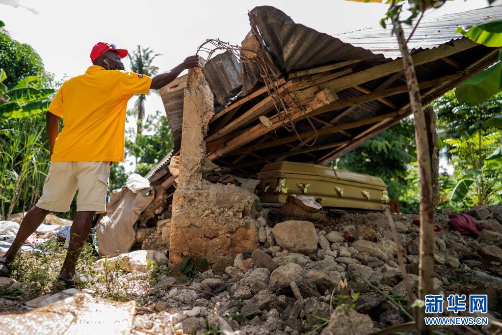 8月19日,海地尼普斯省的一名男子检查因地震受损的房屋。