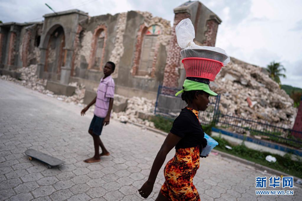 8月19日,海地南部省的一名女子头顶货物经过一处废墟。