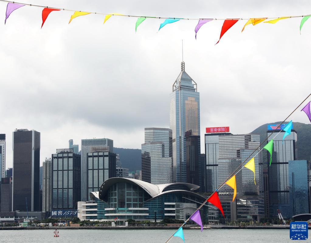 在香港尖沙咀,中华人民共和国国旗和香港特别行政区区旗一起迎风飘扬( 6月29日摄)。新华社记者 李钢 摄