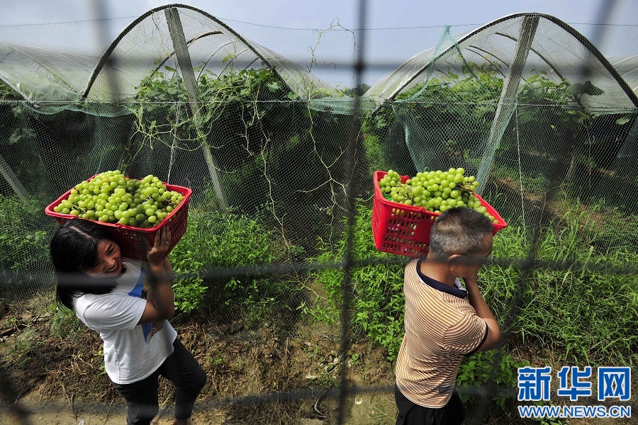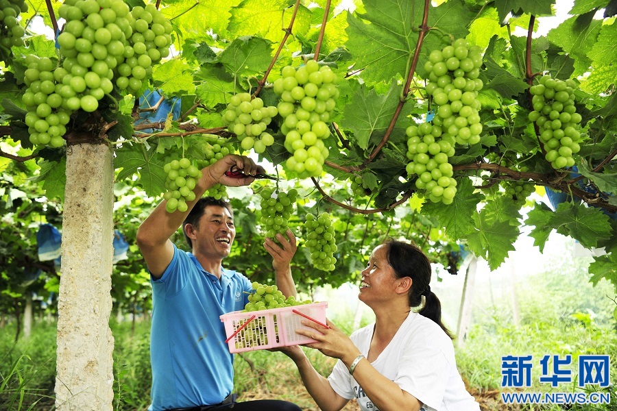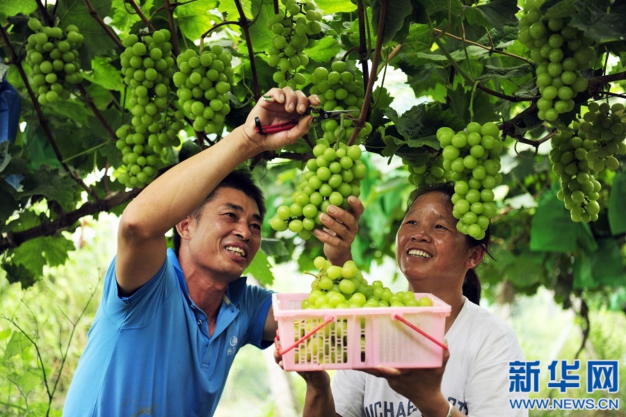 园主罗来兴夫妇在采摘阳光玫瑰葡萄。新华网发 邓龙华 摄
