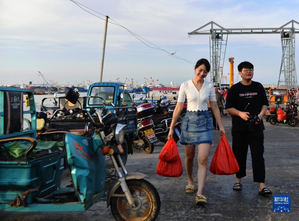 8月17日,在福建莆田市秀屿区平海一级渔港码头,黄莉莉(左)和助手采购用于直播的海产品。