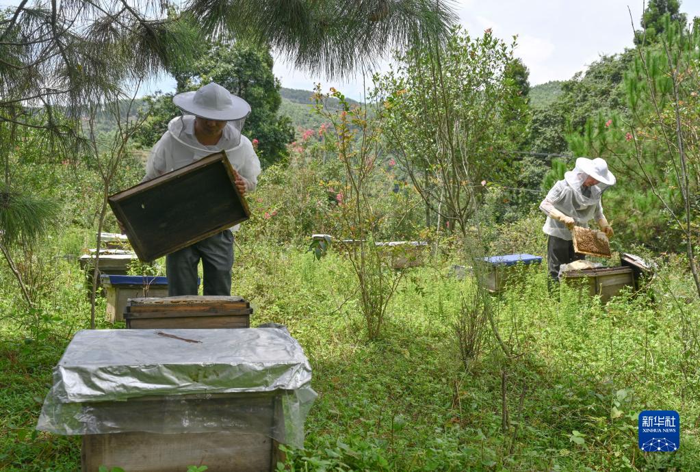 8月12日,在福建泉州南安市向阳乡向阳村,蜂农吴攀峰(左)和父亲吴盾在查看蜂箱。