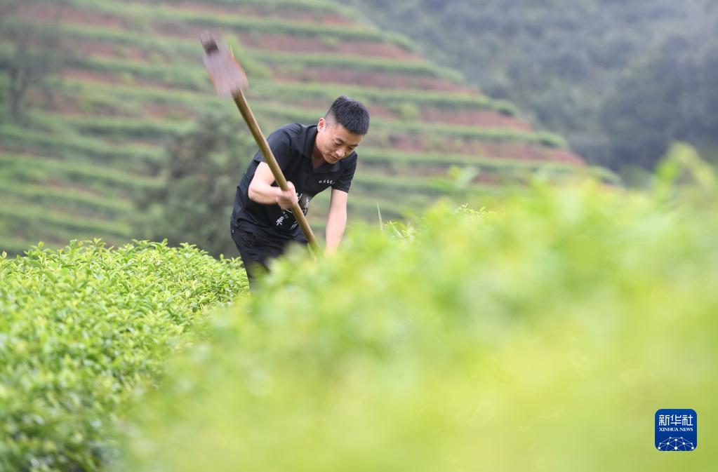 8月17日,在福建武夷山市星村镇前兰村南山岗,武夷山筑梦前兰生态茶叶农民专业合作社直播团队成员叶茂超在茶园翻土。