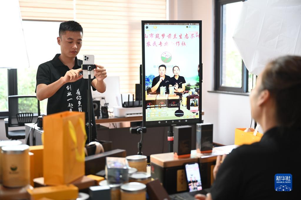 8月17日,福建武夷山筑梦前兰生态茶叶农民专业合作社直播团队成员叶茂超(左)在直播销售合作社的茶叶。