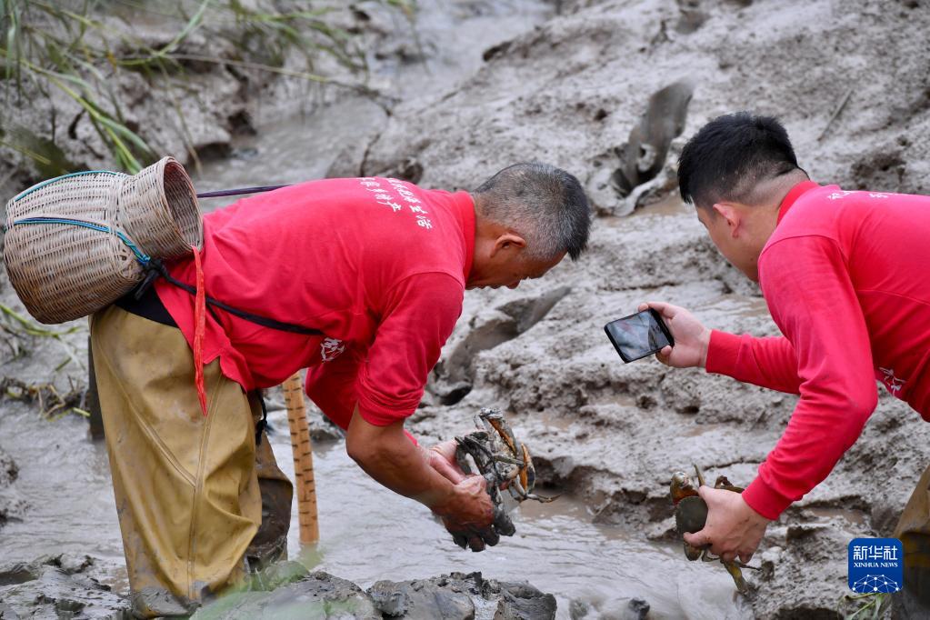 8月13日,福建宁德市霞浦县沙江镇沙江村带货主播张序剑(右)在滩涂上拍摄父亲张应斌赶小海。
