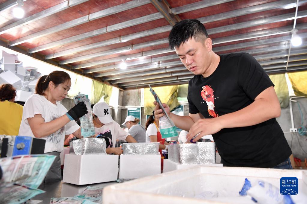 8月14日,福建宁德市霞浦县沙江镇沙江村带货主播张序剑与工人在包装大黄鱼。
