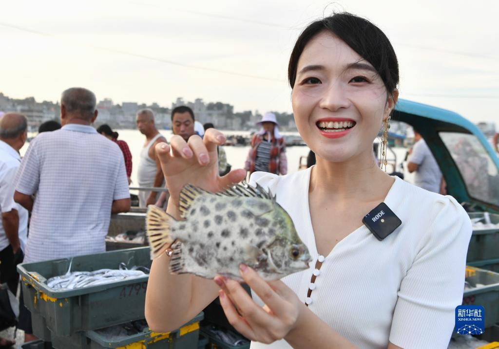 8月17日,在福建莆田市秀屿区平海一级渔港码头,黄莉莉在直播介绍开渔后上岸的海产品金鼓鱼。