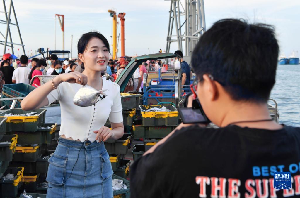8月17日,在福建莆田市秀屿区平海一级渔港码头,黄莉莉(左)在直播介绍开渔后上岸的海产品。