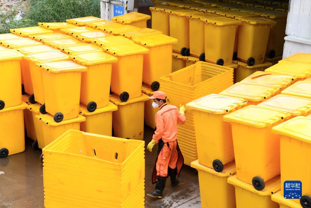 8月21日,在郑州市医疗废物集中处置中心,工作人员在搬运消过毒的医疗废物周转箱。