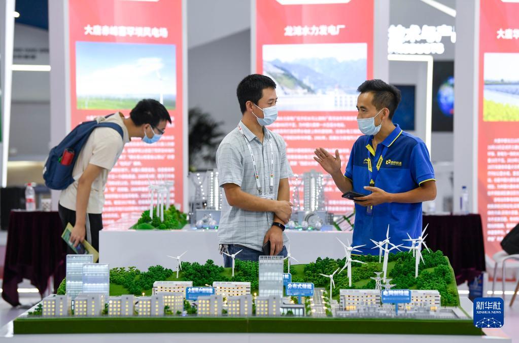 8月22日,在中国-阿拉伯国家博览会清洁能源与新型材料展区,参展的大唐集团有限公司代表(中)与企业代表洽谈业务。