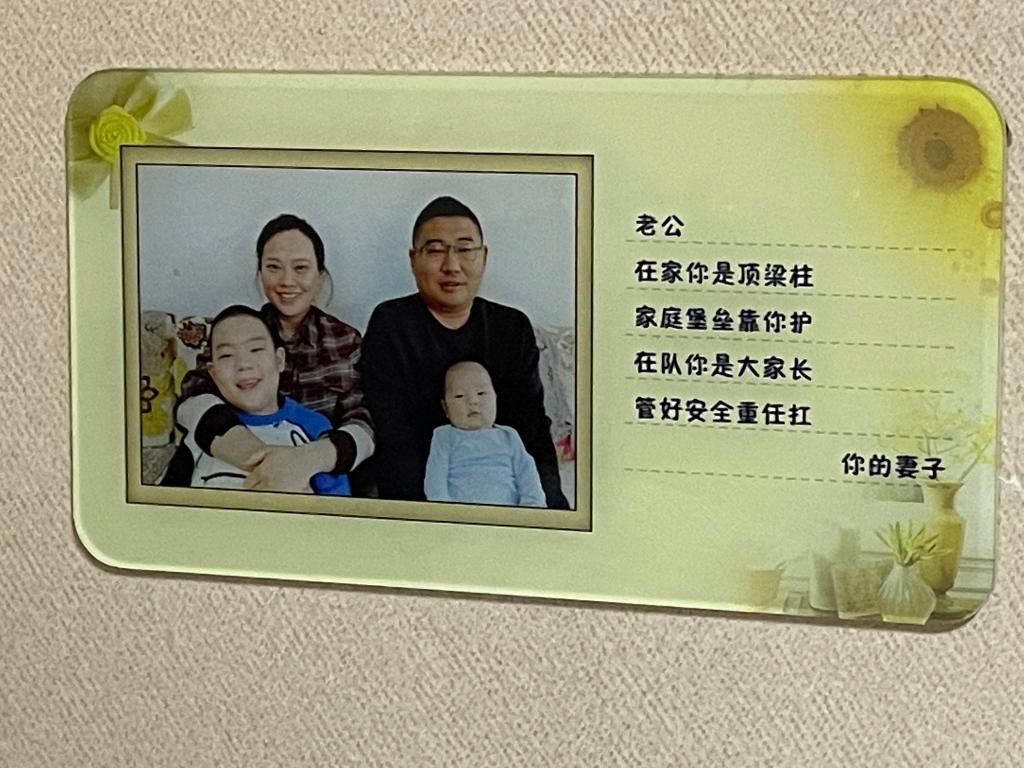 张晶驻地的房间里,床头墙上贴着一张全家福,旁边是妻子写给张晶的话:“在家你是顶梁柱,家庭堡垒靠你护;在队你是大家长,管好安全重任扛。”