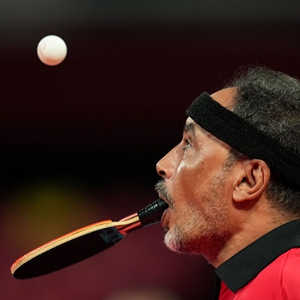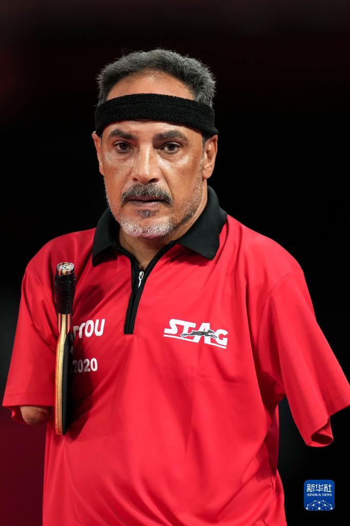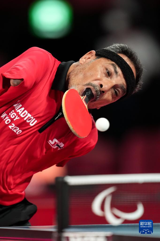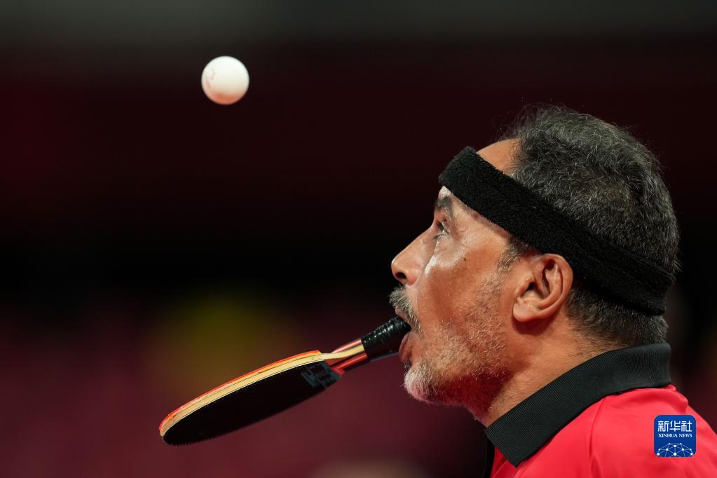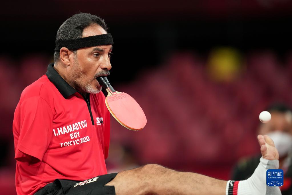 脚趾夹住乒乓球,用力抛向空中,嘴咬着球拍,甩头击球——48岁的无臂运动员易卜拉欣·哈马托无数次重复着这样的发球动作,他是东京残奥会上唯一用嘴打乒乓球的运动员。