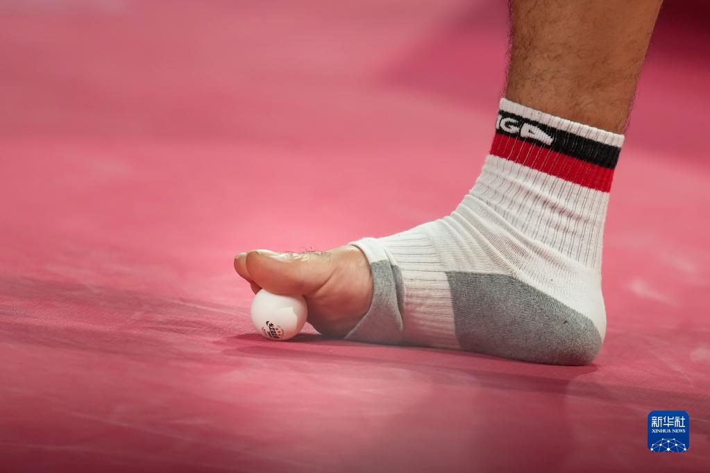 8月27日,哈马托在东京残奥会乒乓球小组赛中准备用脚抛发球。 新华社记者 张铖 摄