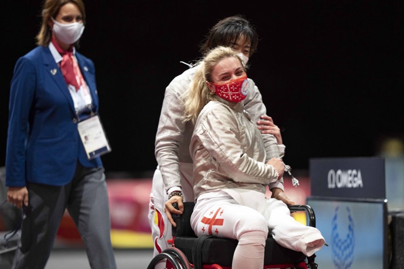 8月25日,中国选手边静(中)在东京残奥会轮椅击剑女子佩剑个人赛A级决赛中获胜后推着格鲁吉亚选手妮诺(右)离开比赛场地。新华社记者 熊琦 摄