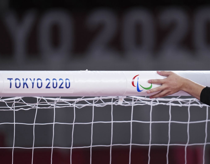 8月26日,在东京残奥会男子盲人门球小组赛中,中国队球员杨明源在赛前感知球门。新华社记者 胡虎虎 摄