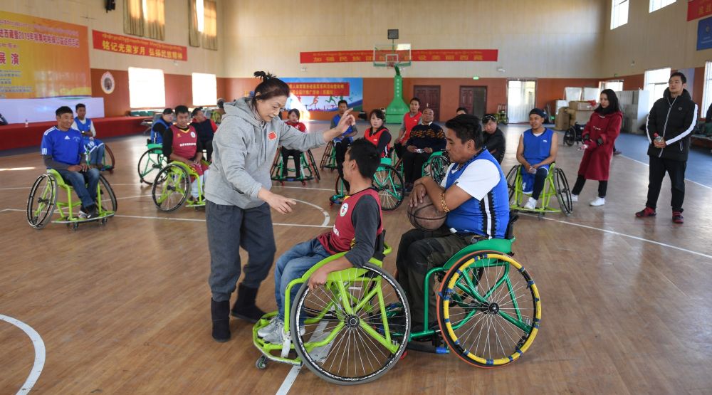 资料图:2019年,中国轮椅篮球队女队教练员韩岩(左前)在指导西藏轮椅篮球队训练。新华社记者晋美多吉摄