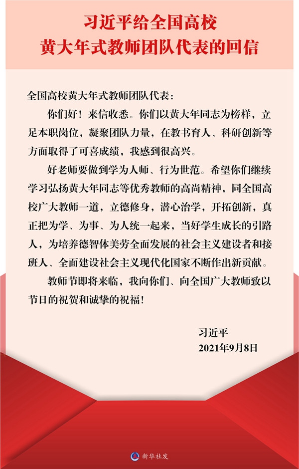 在第三十七个教师节来临之际,中共中央总书记、国家主席、中央军委主席习近平9月8日给全国高校黄大年式教师团队代表回信,对他们寄予殷切期望,并向全国广大教师致以节日的祝贺和诚挚的祝福。