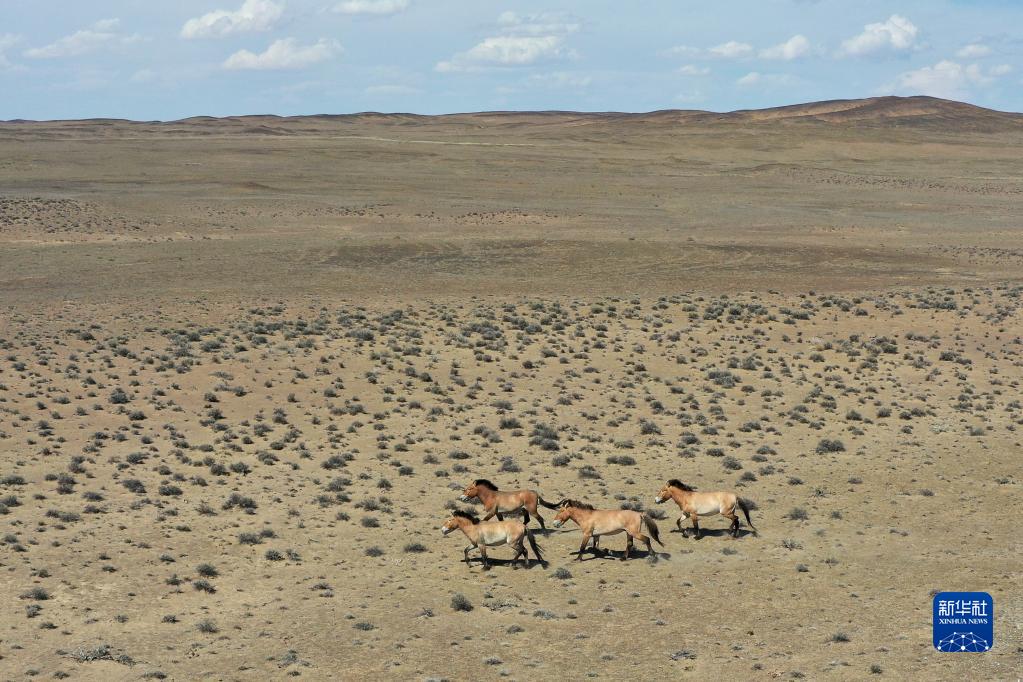 野马在新疆卡拉麦里山有蹄类野生动物自然保护区漫步(2020年6月3日摄,无人机照片)。 新华社记者 丁磊 摄