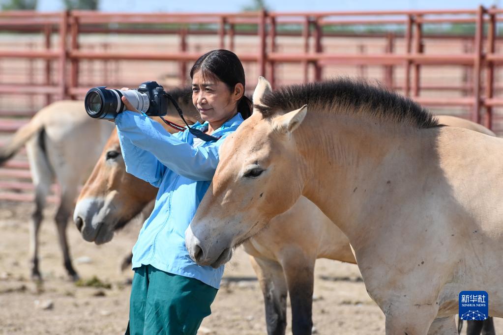 在新疆野马繁殖研究中心,工程师张赫凡拍摄野马照片素材(8月10日摄)。 新华社记者 丁磊 摄