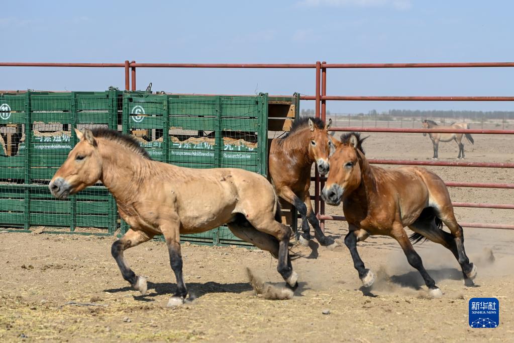 在新疆卡拉麦里山有蹄类野生动物自然保护区乔木西拜野放点,工作人员将即将野放的野马放入大围栏,使其适应野外环境(9月1日摄)。 新华社记者 侯昭康 摄