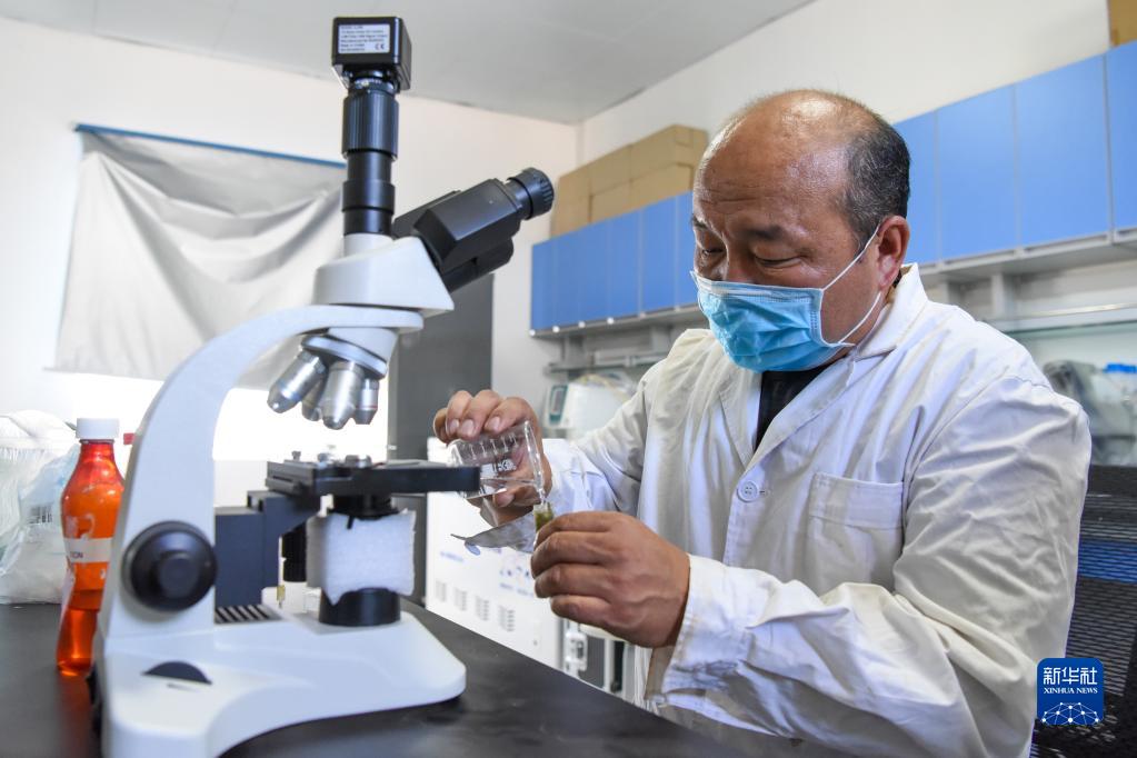 在新疆野马繁殖研究中心,兽医师恩特马克进行马粪的寄生虫检查(2020年6月2日摄)。 新华社记者 丁磊 摄