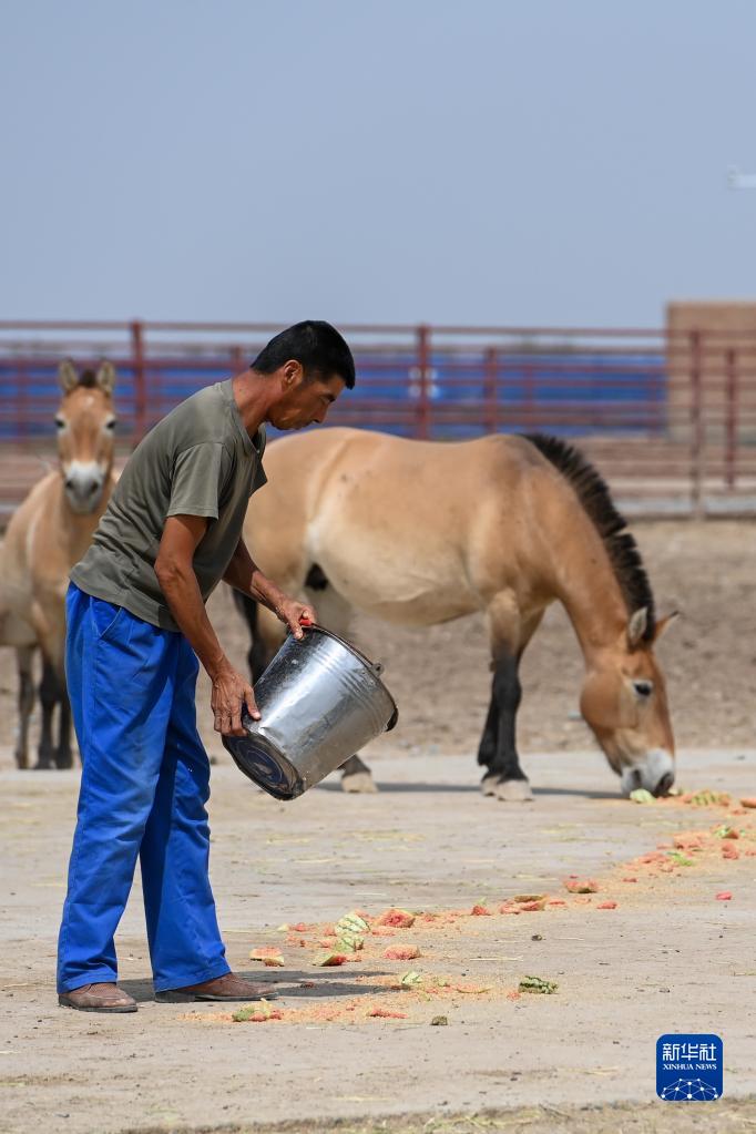 在新疆野马繁殖研究中心,饲养员投喂西瓜,为野马防暑降温(8月10日摄)。 新华社记者 丁磊 摄