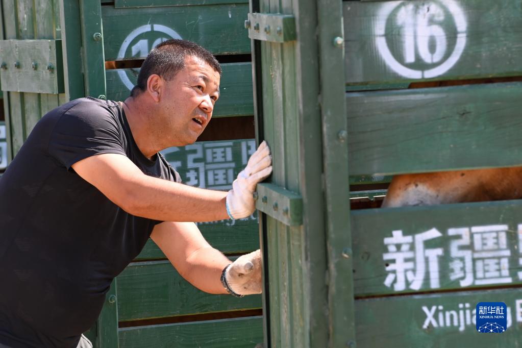 在新疆野马繁殖研究中心,王振彪对即将放归野外的野马进行适应运马箱训练(8月9日摄)。 新华社记者 丁磊 摄
