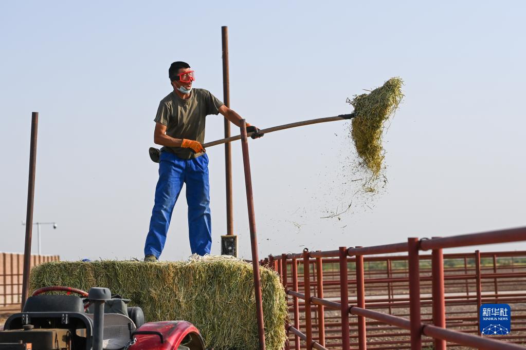 在新疆野马繁殖研究中心,饲养员给野马喂草(8月10日摄)。 新华社记者 丁磊 摄