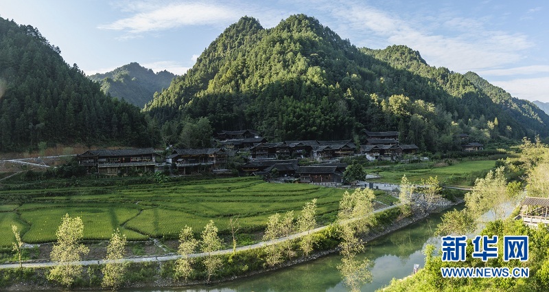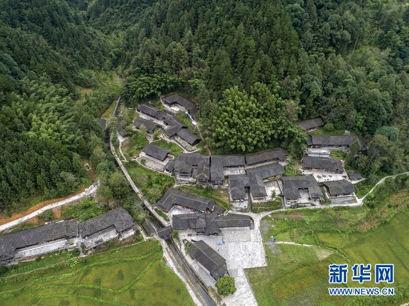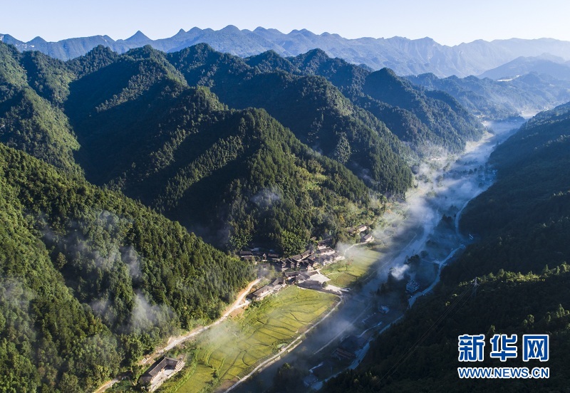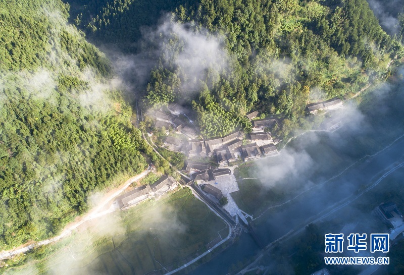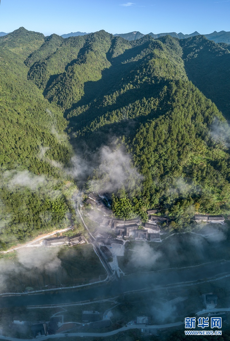 图为群山下的彭家寨吊脚楼群。新华网发 文林摄