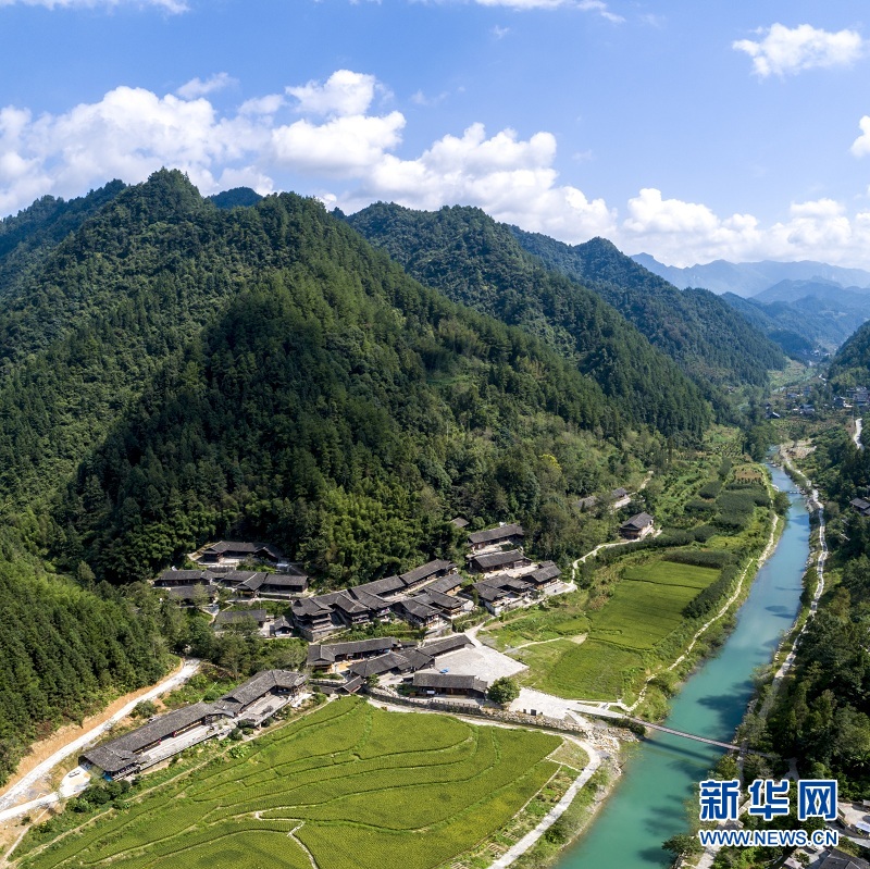 图为蓝天白云下的彭家寨吊脚楼群。新华网发 文林摄