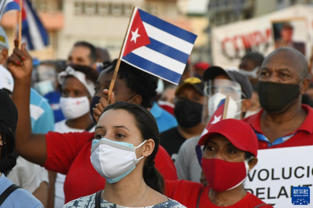 2021年7月17日,约10万民众在古巴首都哈瓦那参加爱国集会,抗议美国对古巴长期封锁、反对美国政府资助反古势力煽动骚乱。新华社发(华金·埃尔南德斯摄)