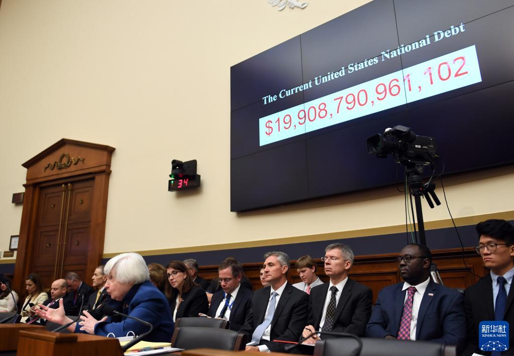 2017年7月12日,美国联邦储备委员会主席耶伦(前)在华盛顿出席国会听证会,屏幕显示美国当时的国债近20万亿美元。到2021年中期,美国国债规模已高达28.5万亿美元。新华社记者 殷博古 摄