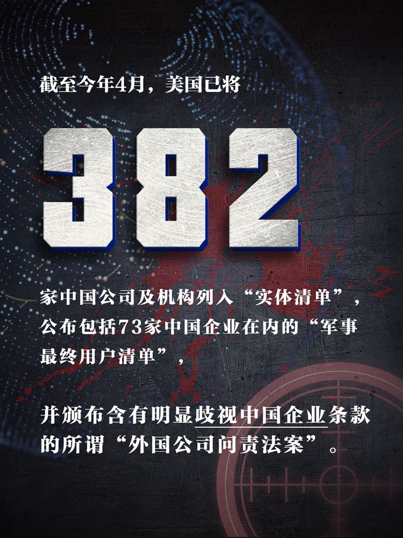 特朗普执政时期,美国为破坏中国安全稳定进而遏制中国发展,在向世界贸易组织提交的文件中正式拒绝承认中国市场经济地位,并蓄意挑起对华贸易争端,对中国高科技企业施加一系列单边制裁措施。拜登政府上台后延续遏华政策,继续滥用国家力量,出台一系列法案和行政令,不择手段打压和限制华为等中国企业。截至今年4月,美国已将382家中国公司及机构列入“实体清单”,公布包括73家中国企业在内的“军事最终用户清单”,并颁布含有明显歧视中国企业条款的所谓“外国公司问责法案”。
