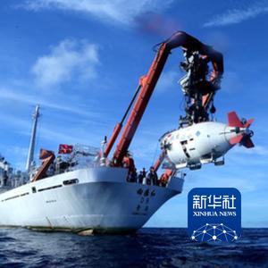 2017年6月13日,在西太平洋海域,“蛟龙”号载人潜水器离开“向阳红09”科学考察船准备进入水中,进行中国大洋38航次最后一潜。新华社记者 刘诗平 摄