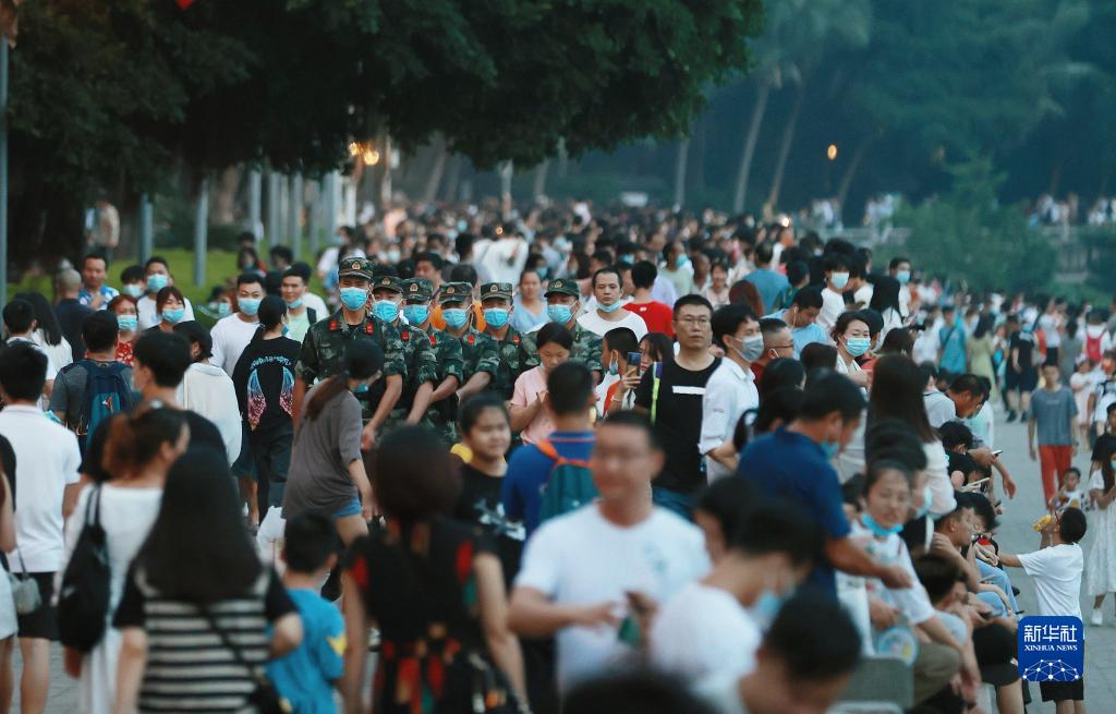 10月1日,武警广东总队执勤第三支队官兵在深圳湾公园内巡逻执勤。新华社发(廖健 摄)