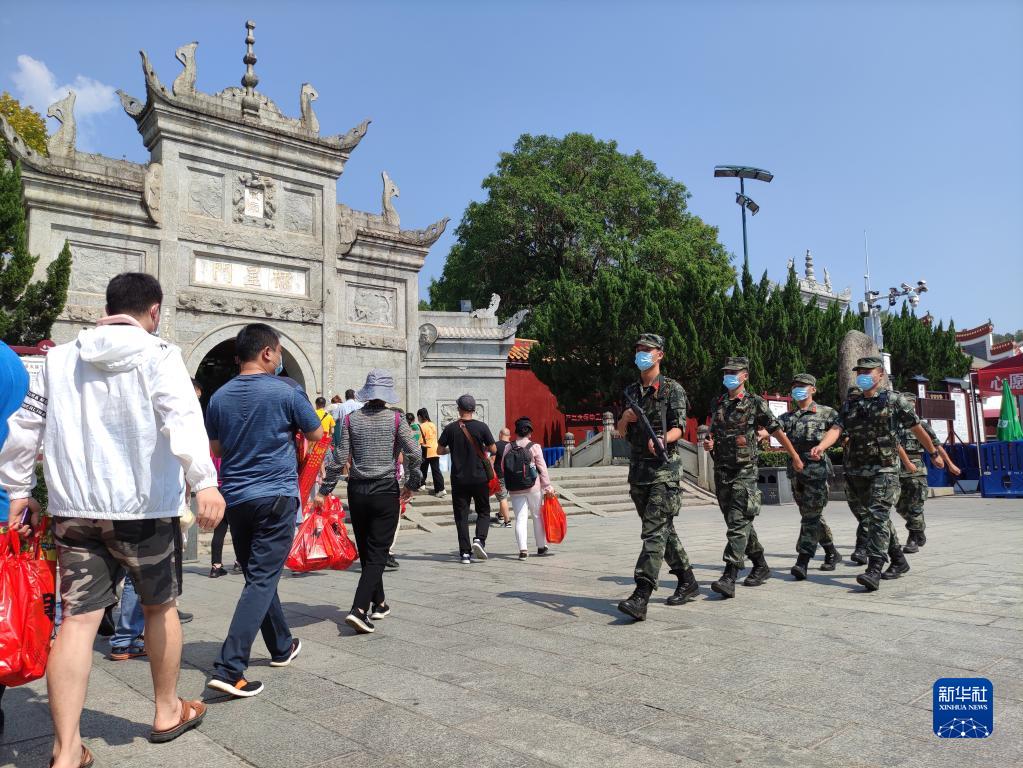 10月2日,武警湖南总队衡阳支队官兵在南岳衡山巡逻执勤。新华社发(范一凡 摄)