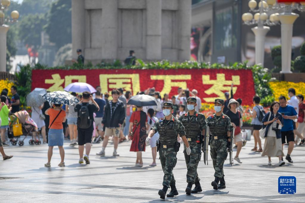 10月1日,武警重庆总队执勤第二支队官兵在重庆解放碑步行街巡逻执勤。新华社发(穆洪超 摄)