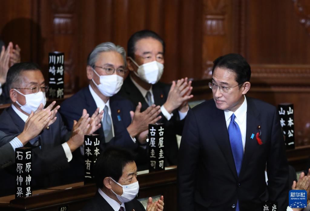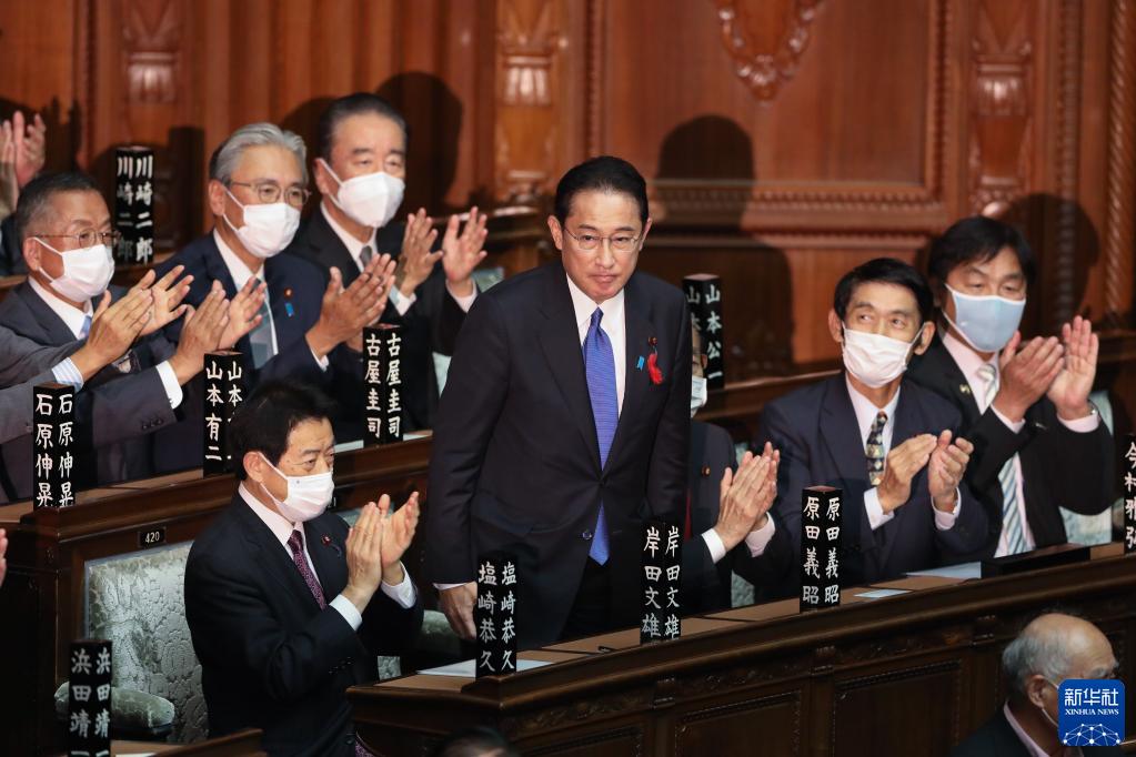 10月4日,在位于东京的日本国会众议院举行的首相指名选举中,自民党新总裁岸田文雄(中)起身致谢。新华社记者 杜潇逸 摄