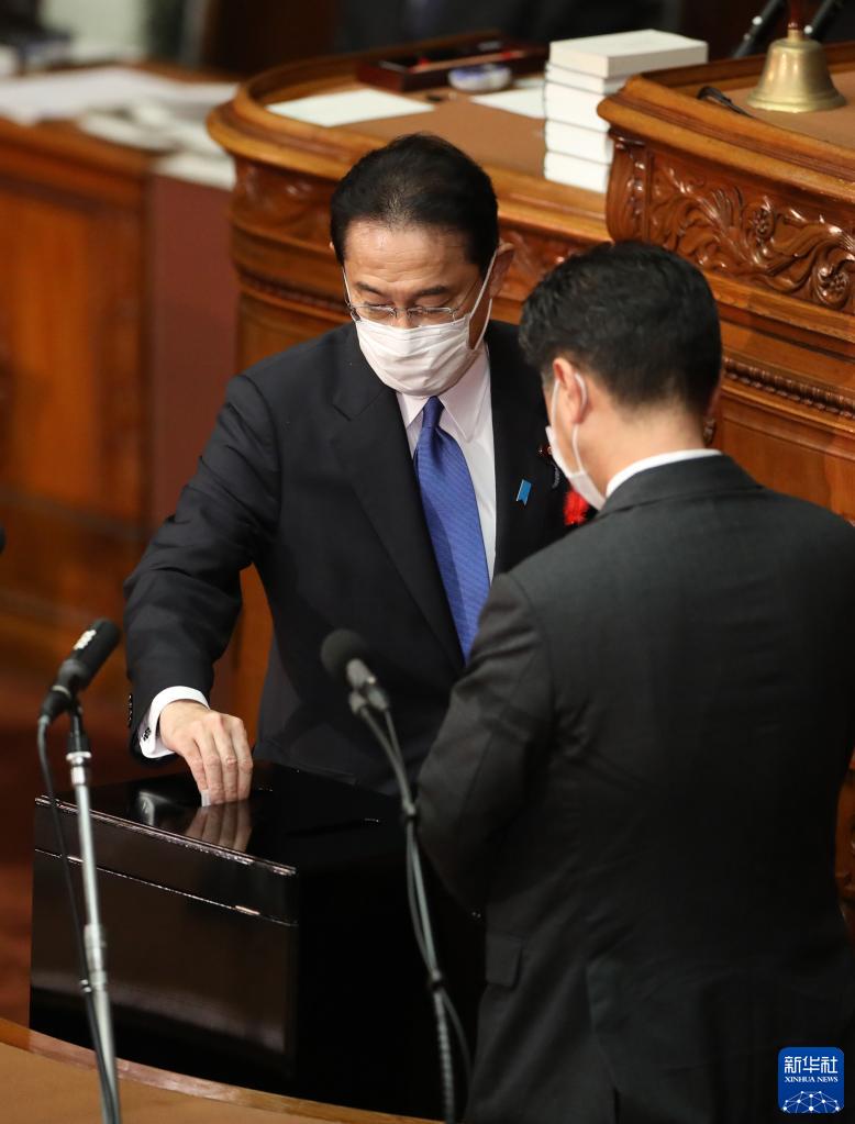10月4日,在位于东京的日本国会众议院举行的首相指名选举中,自民党新总裁岸田文雄(右)起身致谢。新华社记者 杜潇逸 摄