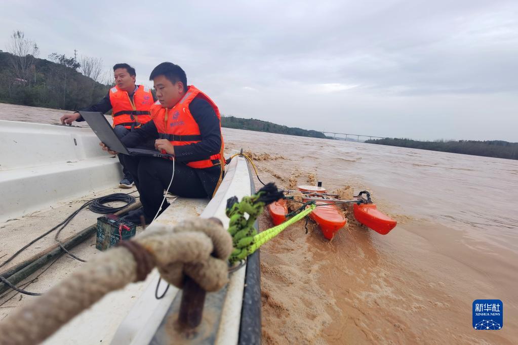 小浪底水文站工作人员测量洪水流量(10月10日摄)。新华社记者 刘诗平 摄