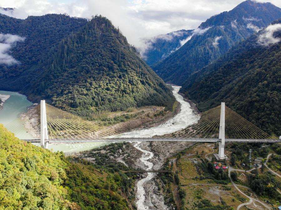 川藏公路通麦路段上的迫龙沟特大桥(2019年10月27日,无人机拍摄)。 新华社记者孙非 摄