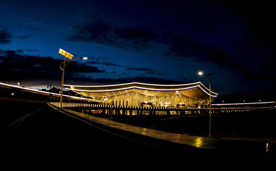 西藏拉萨贡嘎国际机场T3航站楼夜景。 新华社发 周航 摄